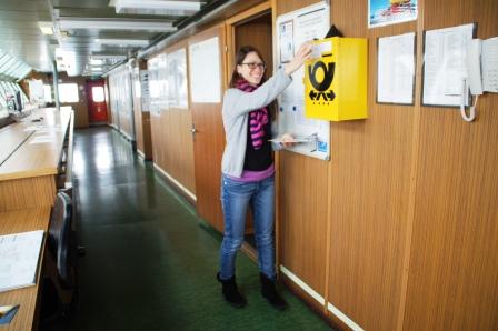 Die Reise geht dem Ende zu und die ersten Vorbereitungen für die Ankunft werden getroffen. D. h. die letzten Briefkastenleerungen sind angekündigt, da die ganze Post für den Weg nach Deutschland vorbereitet werden muss. SONY DSC Andy, der Funkoffizier, betreut die Poststation und hat schon eine ganze Kiste, die unglaublich schwer ist, voller Briefe und Postkarten. Diese Post kommt von der Neumayer-Station, von der Polarstern und von vielen Briefmarkensammlern, die Polarstempel sammeln. Andy hat alle Eure Karten inzwischen gestempelt. Am 18. Januar, wenn wir in Punta Arenas anlegen, geht das Paket über die Chilenische Post nach Deutschland, wahrscheinlich Frankfurt, und von dort nach Herrenberg. Dies ist ein sehr weiter Weg. Ich werde vermutlich fast 2 Tage (mit Zwischenlandungen und Zeitverschiebung) für die Heimreise von Punta Arenas nach Herrenberg benötigen. Die Post kann schon mal gute 3 Wochen unterwegs sein. Ich drücke jedenfalls die Daumen, dass alle Postkarten und Briefe ihren Weg zum Empfänger finden!