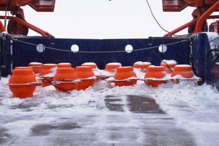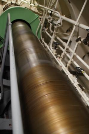 Die Polarstern hat 2 Propeller für den Antrieb, die von bis zu 4 Maschinen (max 14116 kW; ca. 20 000 PS) angetrieben werden. Über zwei zwischengeschaltete Wellengeneratoren wird Strom erzeugt. Falls mehr Strom benötigt wird, können bis zu 2 Hilfsdiesel, welche die Namen Jonathan und Amanda haben, zugeschaltet werden. Traditionell bedingt haben (fast) alle Maschinen einen Namen.  Ein Propeller hat 4 Flügel und insgesamt einen Durchmesser von 4,2 Metern. Ein Flügel ist in etwa so groß wie ich; und das ist anscheinend noch klein.  Über die Stellung/Steigung der Flügel wird zum einen die Fahrtrichtung (vorwärts/rückwärts) bzw. die Geschwindigkeit reguliert. Je steiler die Flügel angestellt werden, umso schneller fährt die Polarstern. Da die Maschinen während der gesamten Expedition rund um die Uhr laufen und noch viele andere Geräte mit Energie versorgt werden müssen, verliess das Schiff Kapstadt mit ca. 3000 Tonnen Brennstoff. Davon werden wir vermutlich 1700 Tonnen verbrauchen, der Rest ist Reserve. Eine Tonne kostet etwa 1000 US Dollar.