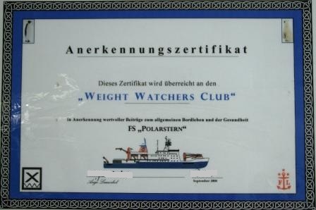 Nun war ich also auf den Namen „BLOG-Pinguin“ getauft und vom Schmutz der gemäßigten Zonen bereinigt, gesalbt und darf auf Ewig die reinen und freien Gewässer südlich des Polarkreises zum Wohle der Forschung befahren. Reingewaschen habe ich mich am Ende allerdings selber, die Kleider sind inzwischen im Müll. Unser Bad stinkt immer noch nach Fisch. Dafür halte ich jetzt meinen Taufschein mit Neptuns Siegel in Händen!