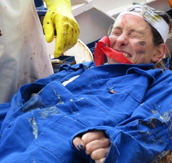 Der Tag der Taufe rückte näher, morgens um kurz vor 7 wurden wir mit Trompeten und Geschrei aus den Betten geholt, gebrandmarkt (Stempel auf der Stirn) und von der „Meerespolizei“ zum Frühstück geleitet. Neptuns Meeresfrühstück war ungenießbar! Zum Glück hatten wir uns alle am Abend davor heimlich ein Überlebenspaket zubereitet. In alten Arbeitskleidern wurden wir einzeln zur Taufe geführt. Der Priester verlas ein Gedicht, in dem der neue Taufname integriert war. Danach ging es durch den Taufparcours. Meine Brille hatte ich zum Glück abgegeben, denn ich wollte gar nicht sehen, was da so fürchterlich stank!!! Es wurde nass, es wurde kalt, es wurde staubig und roch permanent nach Fisch, eine kleine Haarsträhne wurde mir abgeschnitten, dann ging es kopfüber ins Taufbecken. Am Ende kniete ich vor Neptun. Er fragte nach meinem Taufnamen. Zum Glück erinnerte ich mich, denn sonst hätte ich den Parcours ein zweites Mal durchlaufen müssen und das wollte ich nun wirklich nicht.