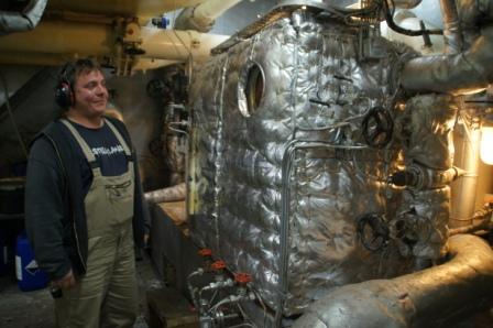 Die Beheizung des Schiffes erfolgt vorwiegend über Dampfanlagen mit direkten und indirekten Heizkreisläufen. Die Kesselanlage erzeugt Dampf, welcher über Rohrleitungen zu den Verbrauchern, die beheizt werden sollen, geleitet wird. Das von den Heizkreisläufen zurückfliessende Kondensat wird im Kesselspeisewasserkondensattank gesammelt und dem Prozess zur Dampferzeugung wieder zugeführt. Dieser sieht sehr futuristisch aus und ist neben Jens im Foto zu sehen (silberner Würfel).