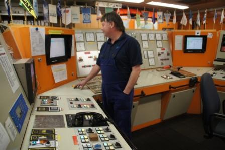 Heute war ich zu Besuch in einer mir sehr fremden Welt – im Maschinenraum der Polarstern. Es war laut, warm und hat etwas nach Öl gerochen. Jens, 2. Ingenieur, hat mich zu sich in den Maschinenkontrollraum eingeladen und mir sehr geduldig und ausführlich die Schaltpulte, mit denen die Maschinen, Tanks usw. bedient werden, erklärt. Danach führte er mich, mit Hörschutz gegen den Lärm, durch den Maschinenraum. Es war eine interessante und spannende Tour durch einen Bereich des Schiffes, den man sonst nicht zu sehen bekommt.