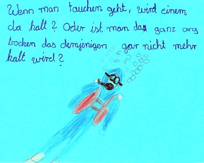 Lea, 6b fragt: „Wenn man tauchen geht, wird einem da kalt? Oder ist man da ganz arg trocken das demjenigen gar nicht kalt wird?“